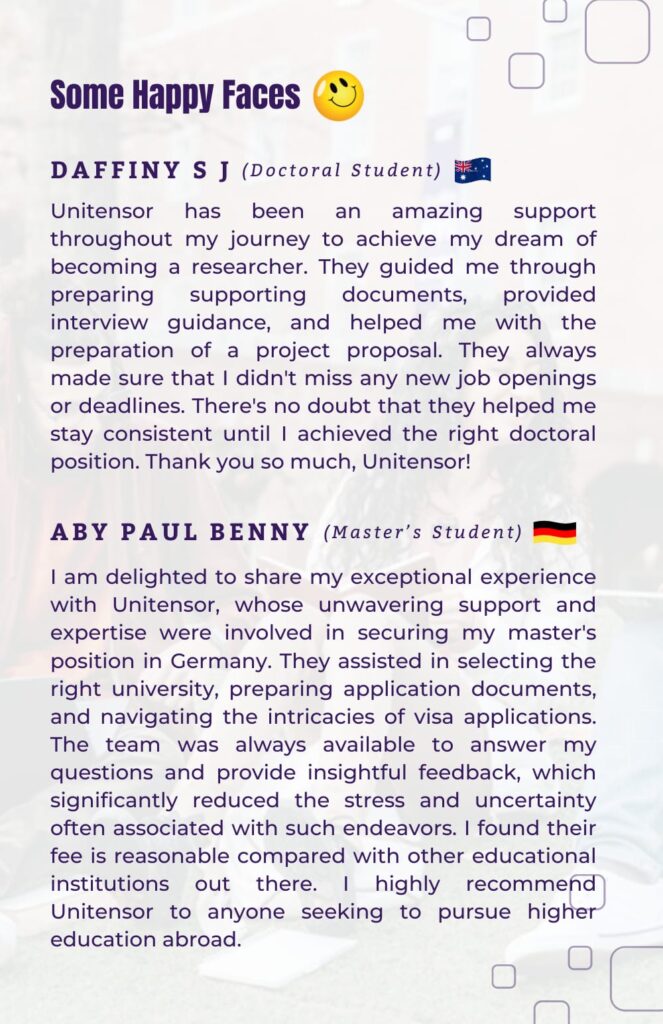 Navigating the vast array of study options can be challenging, and we’re here to simplify the process. Our dedicated team ensures you receive tailored support to align with your goals. With UniTensor, you gain expert guidance to make informed decisions about your future.